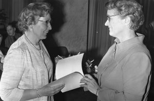 An Rutgers van der Loeff (links) ontvangt Staatsprijs Kinderboek van minister Klompe (2 april 1968). Foto: Jac. de Nijs / Anefo